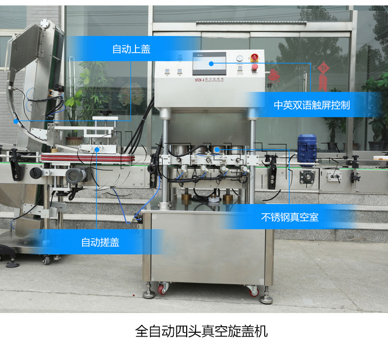 該生產(chǎn)線適合中小口徑三旋、四旋玻璃瓶調(diào)味醬的分裝,適合醬料、含顆粒黏稠物料的灌裝,物料接觸部分均采用316不銹鋼,整機304不銹鋼,符合食品衛(wèi)生標(biāo)準(zhǔn)。該機設(shè)計合理,機型小巧,立式結(jié)構(gòu),節(jié)省場地,操作方便。啟動部分均采用FESTO和臺灣AirTack的氣動元件。灌裝閥有氣動閥控制,灌裝精度更高,灌裝量和灌裝速度均可任意調(diào)整,灌裝悶頭采用防拉絲及升降灌裝裝置。