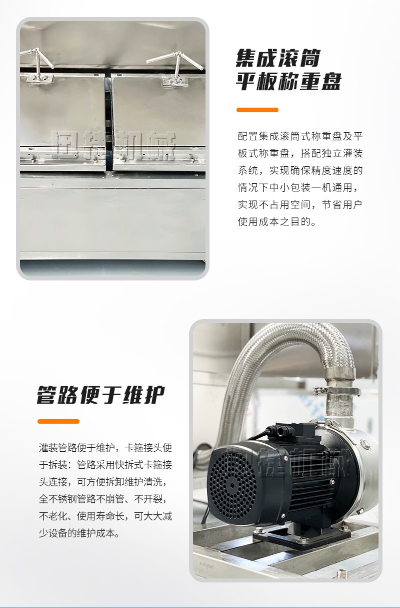 集成滾筒、平板稱重盤,一機多用,方便快捷:配置集成滾筒式稱重盤及平板式稱重盤,搭配獨立灌裝系統,實現確保精度速度的情況下中小包裝一機通用,實現不占用空間,節(jié)省用戶使用成本之目的。