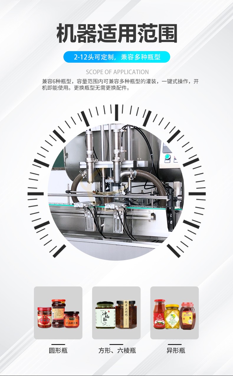 全自動雙頭醬料灌裝機兼容6種瓶型,容量范圍內(nèi)可兼容多種瓶型的灌裝,一鍵式操作,開機即能使用。更換瓶型無需更換配件。