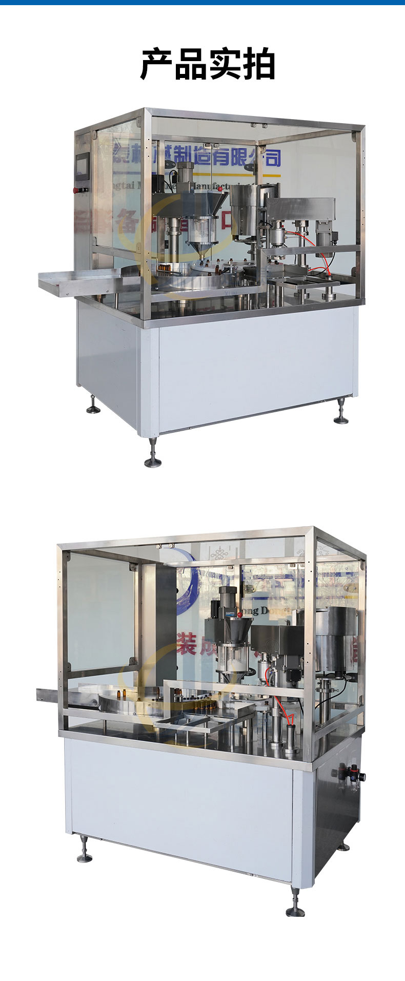 全自動粉劑灌裝旋蓋一體機(jī)適用于微量類面粉粉劑灌裝。人工進(jìn)瓶,設(shè)備自動進(jìn)瓶,自動定量灌裝,自動旋蓋。PLC觸屏控制。