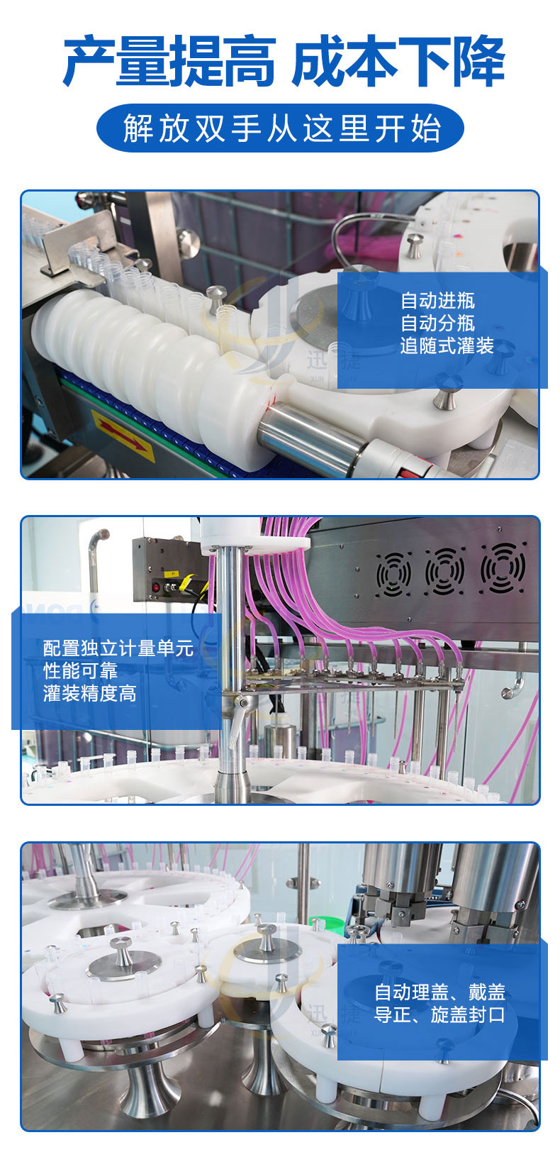 全自動診斷試劑灌裝旋蓋生產(chǎn)線由理瓶器整理成列,逐個送入進管絞龍,并自動進入等分盤中,等分盤作不同等分的間歇運動。