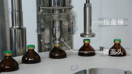 掛好蓋子后,壓蓋錘把蓋子壓到底;鎖蓋頭通過(guò)爪刀將瓶蓋與瓶身軋為一體